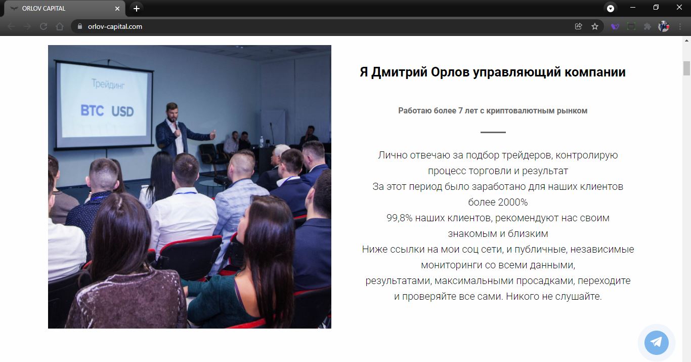 Затем он начал «обучать» людей продавая курсы касающиеся тематики криптовалют по $99. Что же до Orlov Capital, то только в середине 2018 он задумался, что можно обманывать людей предлагая им услуги управления счетами «от лучших и неизвестных теневых трейдеров криптовалют, которых в мире всего 1%». Вот ничего не вызывает подозрений? Как думаете, если бы Орлов имел доступ к таким «специалистам», учитывая сложный процент и накопленные деньги с проданных «курсов» и прочей сомнительной деятельности, стал бы он и дальше заниматься мошенничеством? Стал бы он мучаться с инвесторами, которые хотят вложить 500 долларов и которым все надо рассказать да показать. Ответ тут очевиден - конечно нет. Все это показуха это лишь рекламные слоганы с целью получить новую стаю настоящих инвесторов, который позволят Орлову воплотить свои желания к красивой жизни.