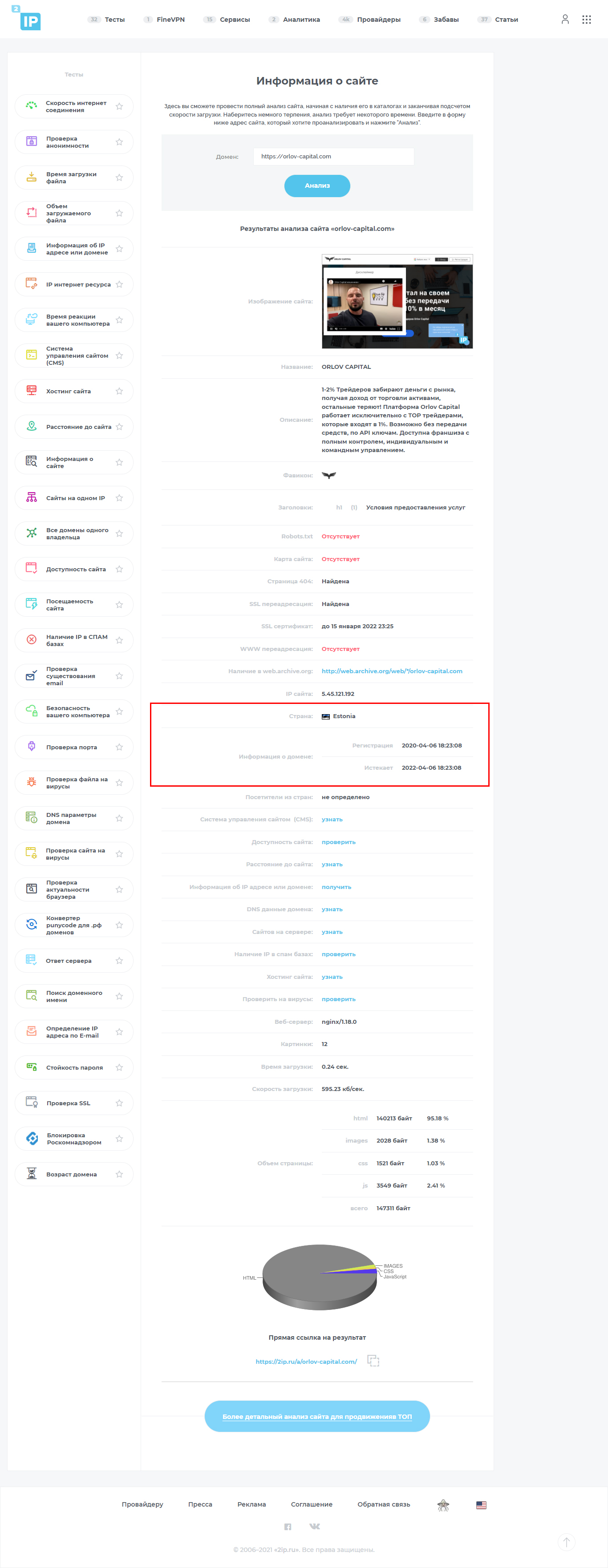 Сайт Orlov Capital был зарегистрирован только в 2020 году, хостинг в Эстонии, а владелец скрыт. Афере, которая стала способом на жизнь, не более 2-х лет, но никак не 7.