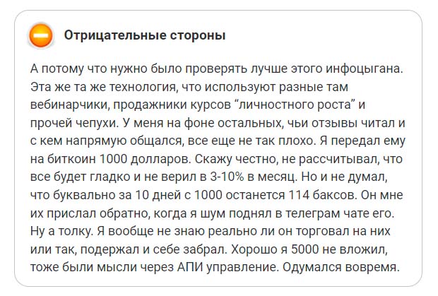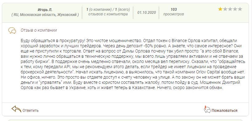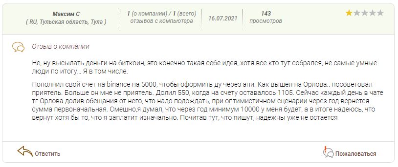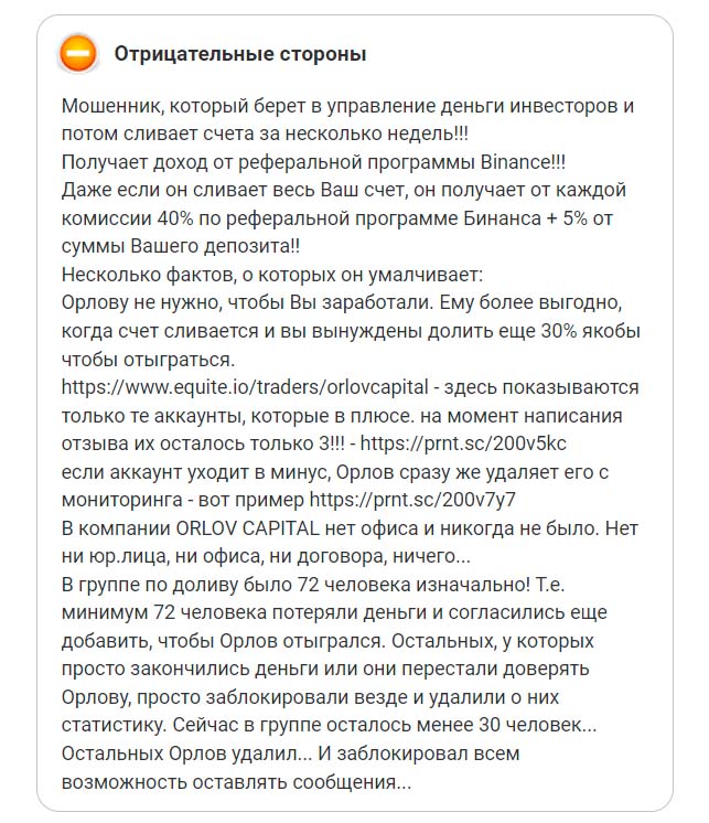 Доверительно управление происходит через копирование сделок с материнского трейдерского аккаунта Орлова по токену API. На нем может быть всего $500, тогда, как у клиента сумма может доходить до $50000 и выше. Прибыль 10% в месяц приносит Орлову $2500 с аккаунта клиента, а на убытке в 10% он потеряет всего $50 со своего аккаунта. В то же время его клиент с $50000 потеряет все $5000. Кстати есть еще секрет - можно держать два материнских аккаунта и открывать сделки в противовес, тогда на одном всегда будешь в выигрыше. Очень напоминает классический букмекерский развод. То есть, если упростить, пока идет заработок - он делится 50 на 50. Все рады, инвестор заработал, Орлова тоже. Потом идет слив, инвестор теряет все деньги. Орлов же остается с деньгами, которые получил вначале. Вот где настоящая работа “без рисков” и вложений. Вот отзывы обманутых людей: