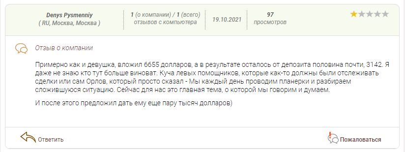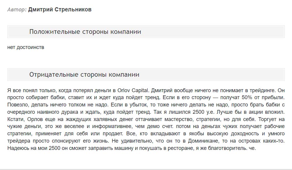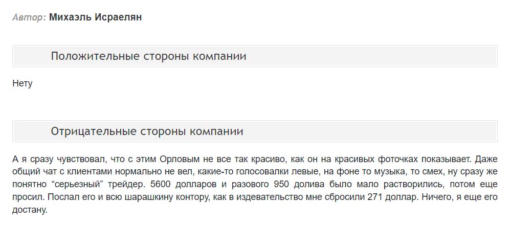 «Орлов, [удалено], тебе это просто так не сойдет! Мне не жало те 2к баксов, я их зарабатываю за пару дней, но ты [удалено] меня, а это уже другое дело вообще!! Дело чести! Ты говорил, что риск контролируемый и ты типа [удалено] спец. а на деле оказалось, что ты не Лев Толстой, а [удалено] простой! Пусть другие видят, я везде куда дотянусь расскажу о таком [удалено] [удалено]. Думаешь может безнаказанно [удалено] людей! [удалено] там! Мой папа работает в прокуратуре Харькова, тебе [удалено] [удалено] [удалено]. Нам пришлось убрать обсценную лексику, чтобы впечатлительные читатели не расстроились. Примерно 20% отзывов такого содержания. В любом случае всех объединяет одно — люди пострадали от действий Orlov Capital.»