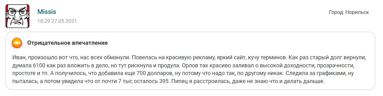 Цинизм Орлова заключается в том, что потерявших деньги инвесторов он уговаривает пополнить депозит еще, чтобы «отыграть» ситуацию. Или просто долить денег, чтобы отодвинуть ликвидацию. Этим всем он просто психологически держит вкладчика в узде, ведь чем дольше он будет иметь надежду, тем лучше для Орлова. Разве вам не напоминает это МММ с их “перезагрузками”?